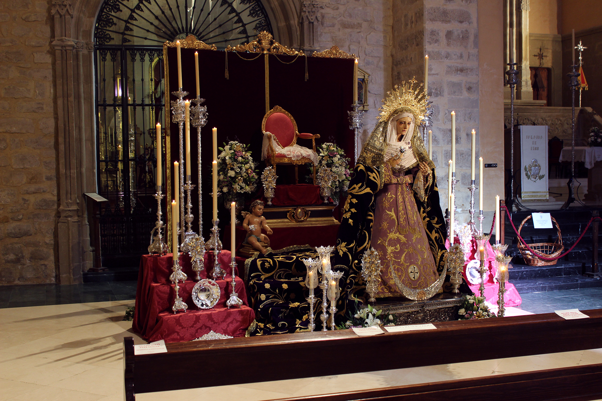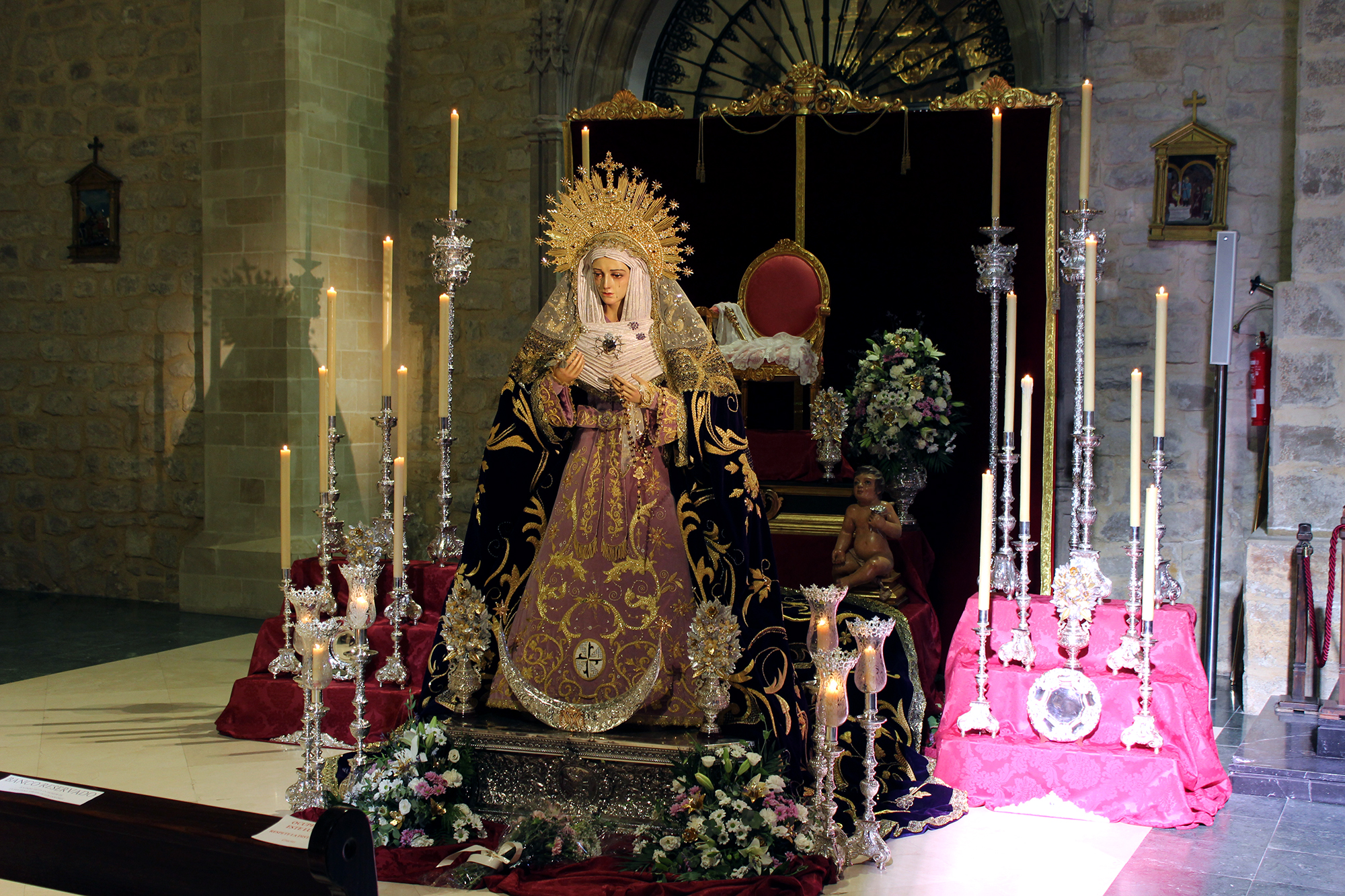 Para la ocasión, la Cofradía montó un precioso altar de cultos en el que se destacaba la realeza de María, dado que en la parte de atrás del mismo figuraba un trono de reina, del que la Virgen había descendido para mostrarse a la veneración de los fieles en su peana procesional. Nuestra Madre estaba hermosamente ataviada con su saya procesional en color malva y el manto de procesión, sobre su cabeza llevaba la diadema que un grupo de hermanos le regaló con motivo del 60 aniversario de su hechura y bendición y estrenaba para la ocasión un rostrillo y unas flores de talco para su mano, donado todo ello por hermanos de la Cofradía.