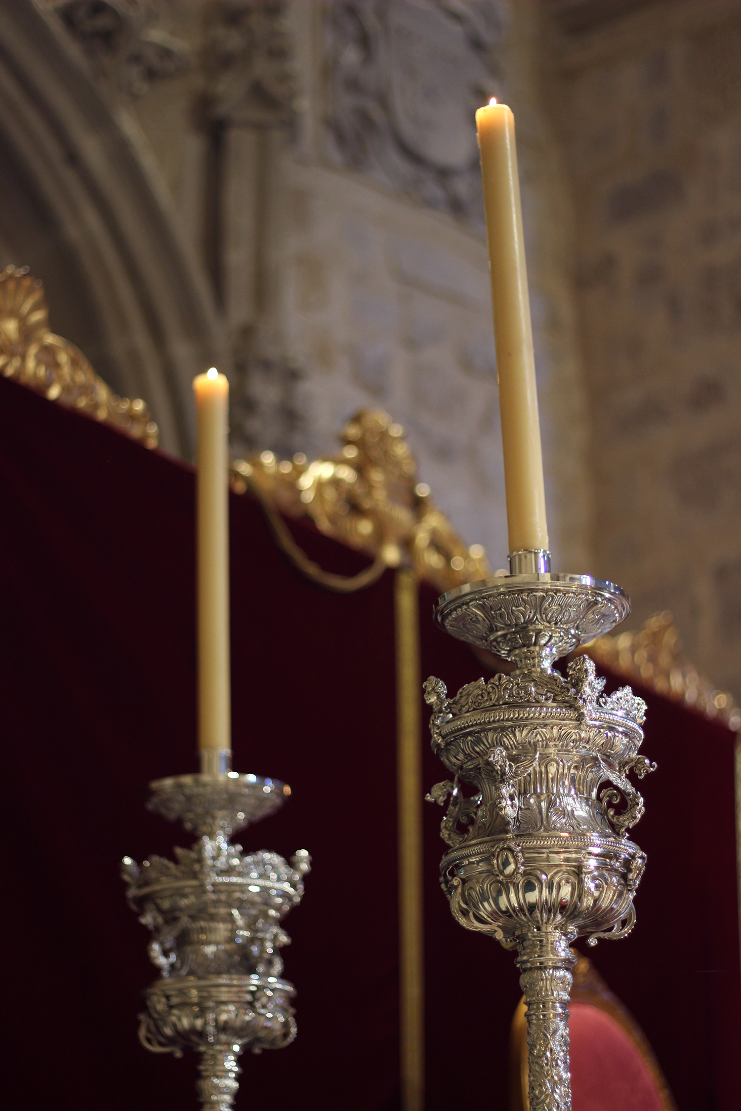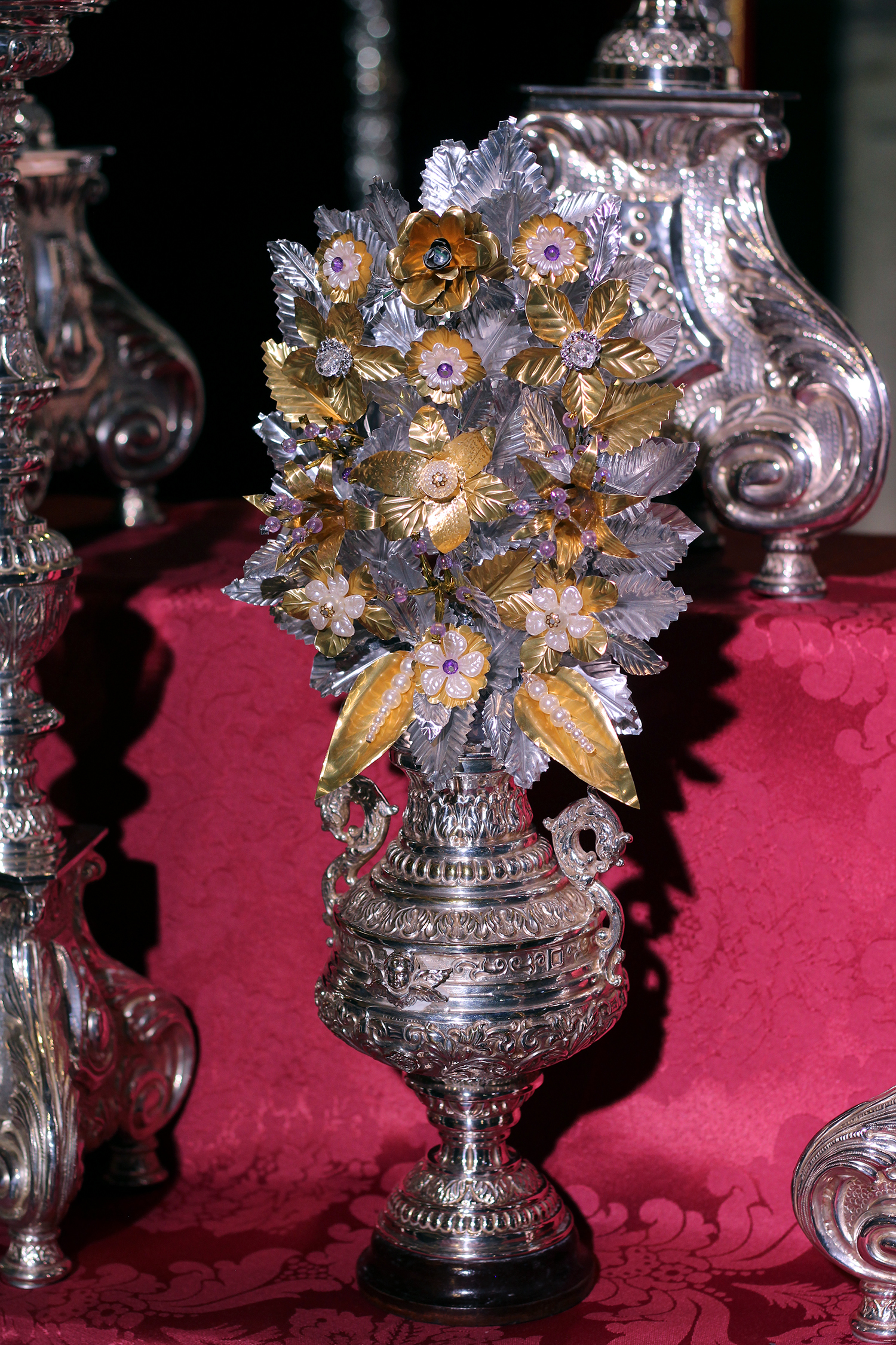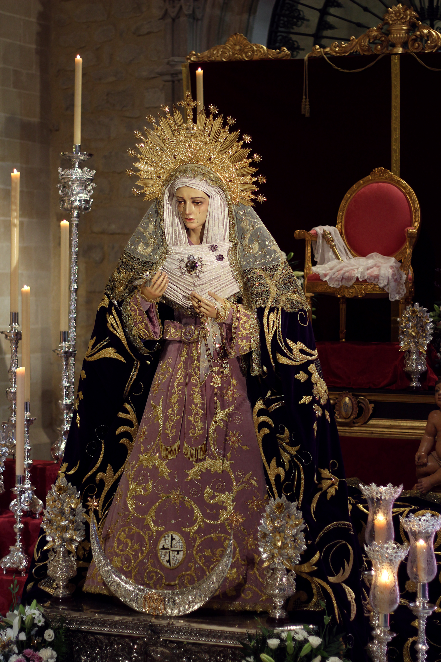 En el altar también podían verse el magnífico juego de ciriales para el cortejo litúrgico de la Virgen de los Dolores, realizados por Orfebrería Orovio de la Torre, y que estaba previsto que se estrenasen el pasado Viernes Santo, así como seis delicados ramos de flores de talco donados por un grupo de hermanos de la Cofradía.