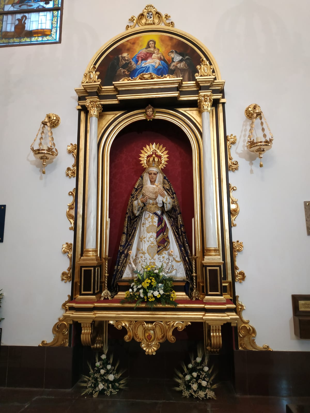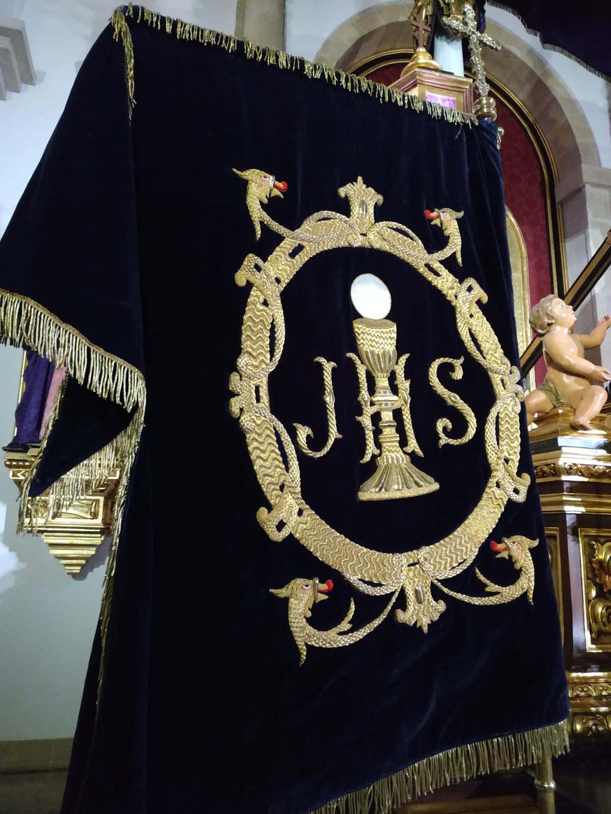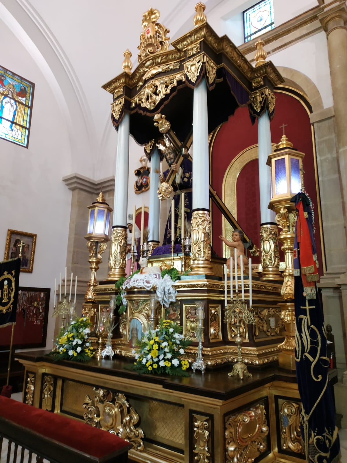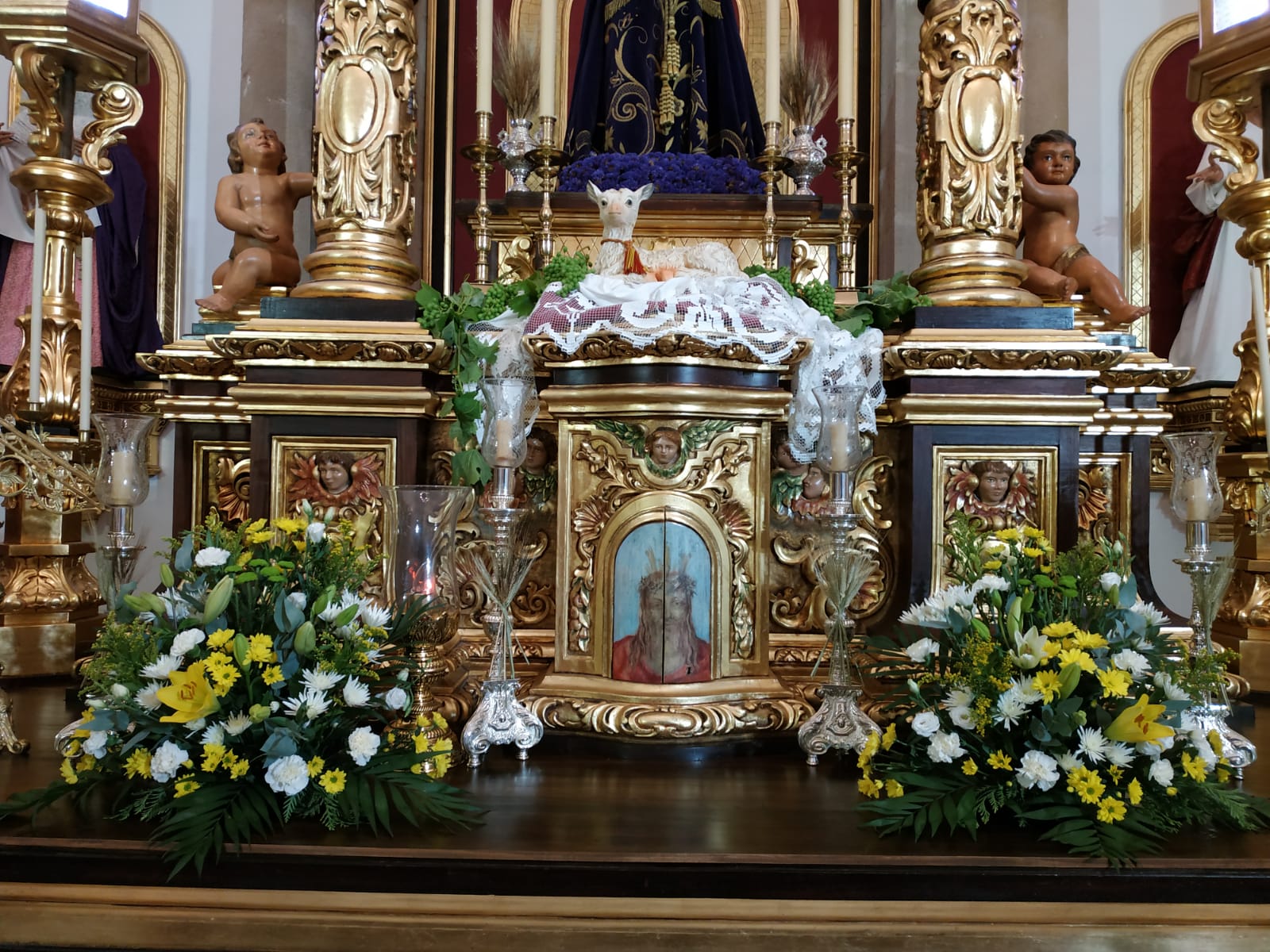 Por ello, para la ocasión la Priostía de la Hermandad ha engalanado la Capilla de Jesús con motivos eucarísticos, tales como espigas y uvas, un cordero pascual y flores en tonos amarillos y blancos. Dentro del exorno de la capilla destacan especialmente la presencia de la bandera con la insignia de la Adoración Nocturna de nuestra ciudad con la que estamos hermanados y muy especialmente del Pendón de Jesús, expuesto por su parte sacramental. Actualmente el pendón de Jesús es la insignia eucarística más antigua de nuestra ciudad y es copia fiel de otro del siglo XVIII que aún conserva la Cofradía.